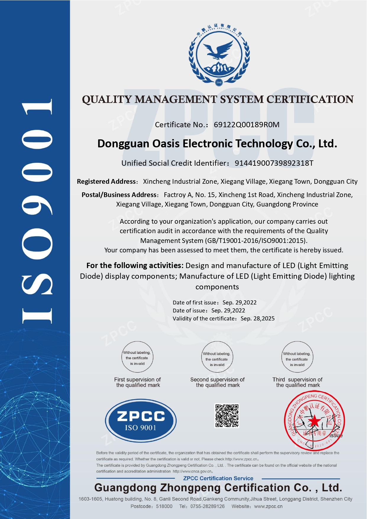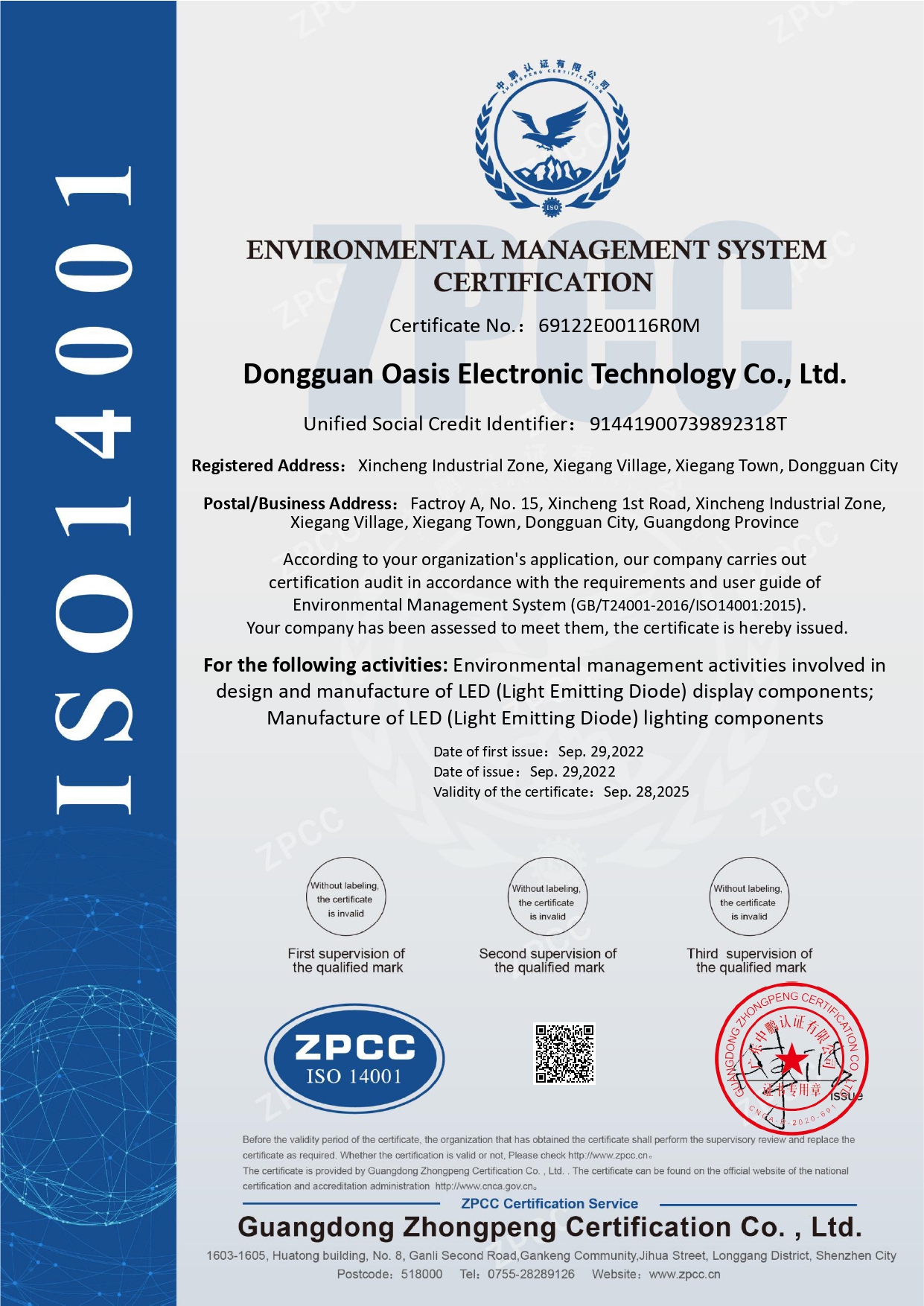 Oasistek has received numerous international quality certifications including ISO9001:2015 and ISO14001:2015, and has successfully met the quality and reliability demands of numerous leading global manufacturers.